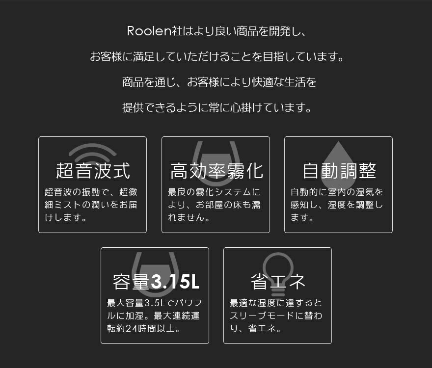 名称:超音波加湿器 商品名:Roolen Breath超音波加湿器 製造社:Roolen 原産国:台湾 容量:3.15L 重量:1.1kg 箱サイズ:22.2×22.2×34cm商品詳細 説明 Roolen社はより良い商品を開発し、お客様に満足していただけることを目指しています。