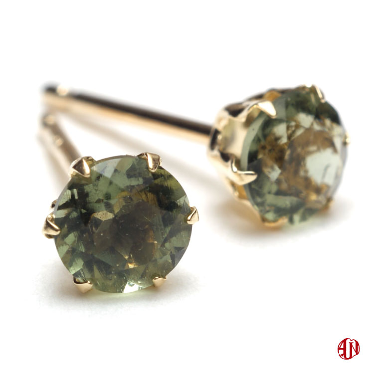 ◆セカンドピアス◆ モルダバイト 約5mm チェコスロバキア K18 スタッドピアス ヒーリングストーン モルダバイトは、1480万年前の隕石の落下による衝撃で地表の物質と隕石の成分が溶解して形成された神秘の天然ガラスです。